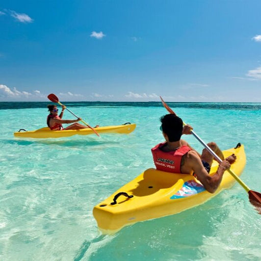 Kayaks & Stand‑Up Paddleboards – Paddle into Paradise! Discover Maafushi’s stunning coastline from a unique, serene perspective with Kayak and Stand‑Up Paddleboard (SUP) rentals from Maafushi Dive and Water Sports. Explore hidden coves, drift over vibrant reefs, and immerse yourself in the crystal-clear waters: a perfect blend of adventure, relaxation, and mindful exploration. STANDUP PADDLE 1 hour paddle away gently around the calm and crystal clear waters of Maafushi surrounded by vibrant coral gardens and curious fish, sting rays, turtles swimming beneath the shallow waters. KAYAKING Peacefully paddle through the mesmerizing marine biodiversity beneath the crystal clear shallow waters of the Indian Ocean. This non-motorized sports lets you explore lagoons surrounding Maafushi effortlessly.